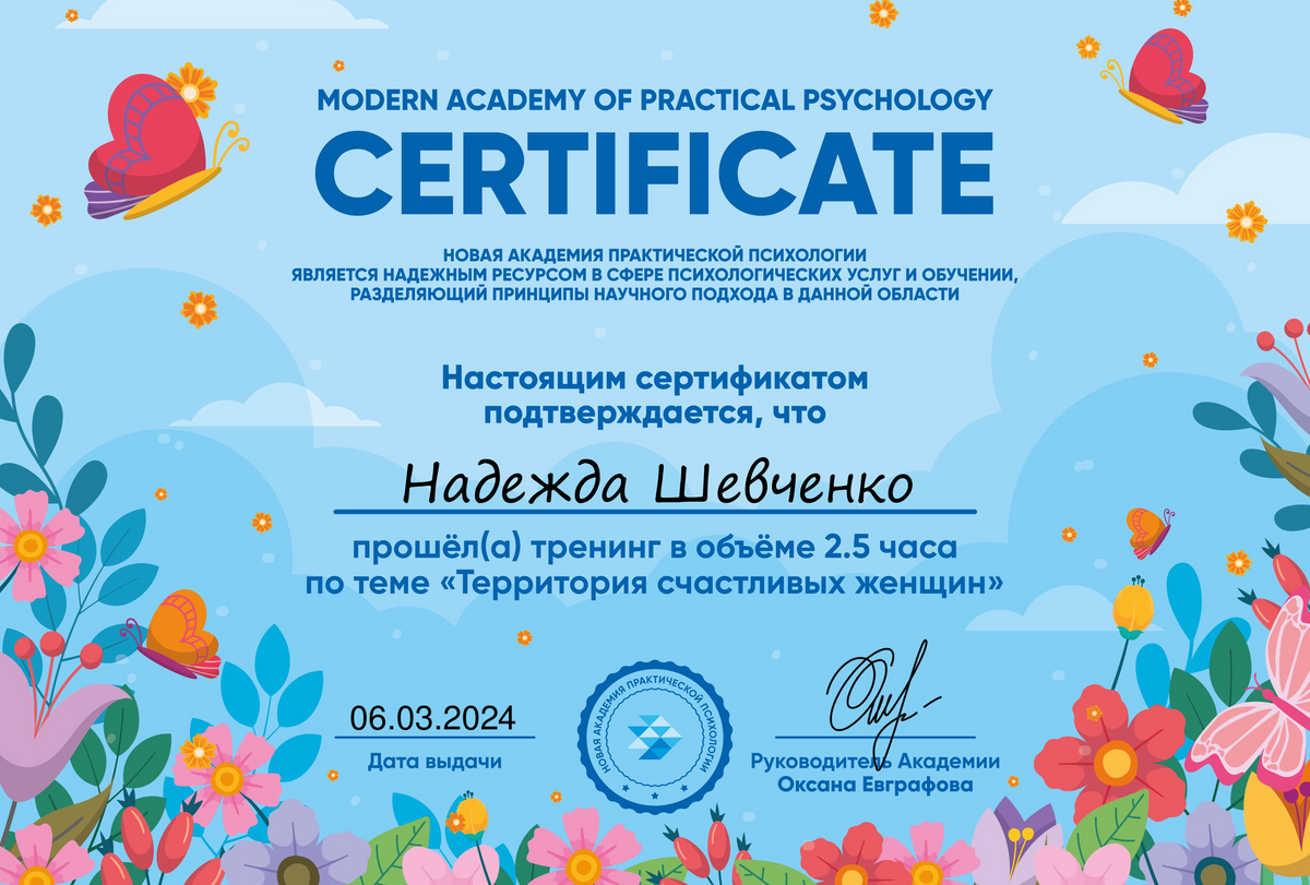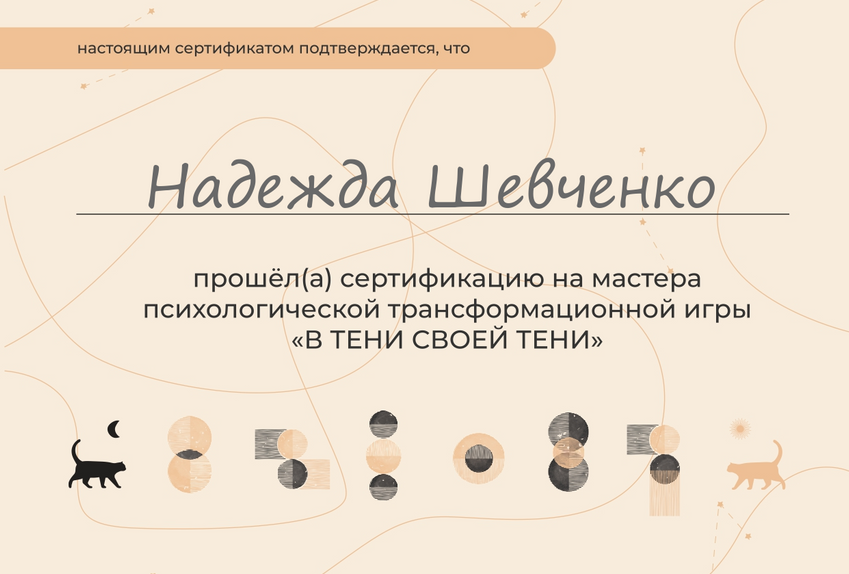 Прошла сессию про теневую сторону. Очень познавательно. Открылись неожиданные стороны себя. Надежда подсветила ресурсные моменты. Большок спасибо за сессию.