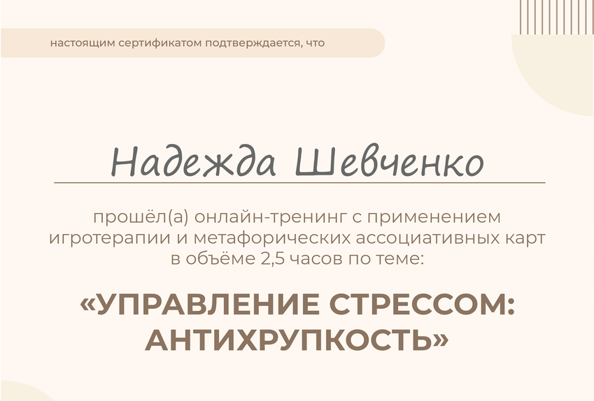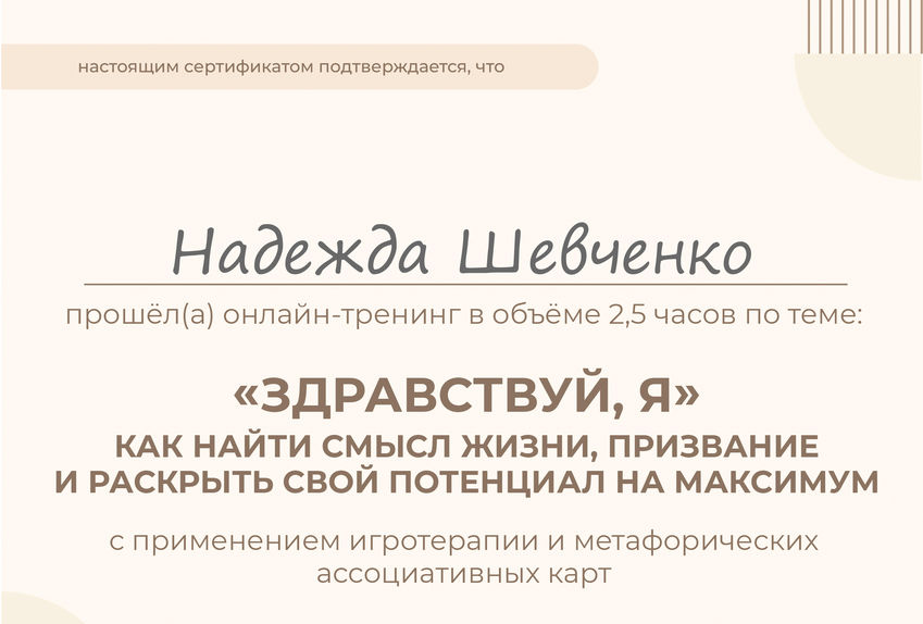 Надежда замечательно провела сессию, я получила ответ на свой запрос. Эта игра позволила заглянуть внутрь себя и найти ресурсы, которые я раньше не осознавала.